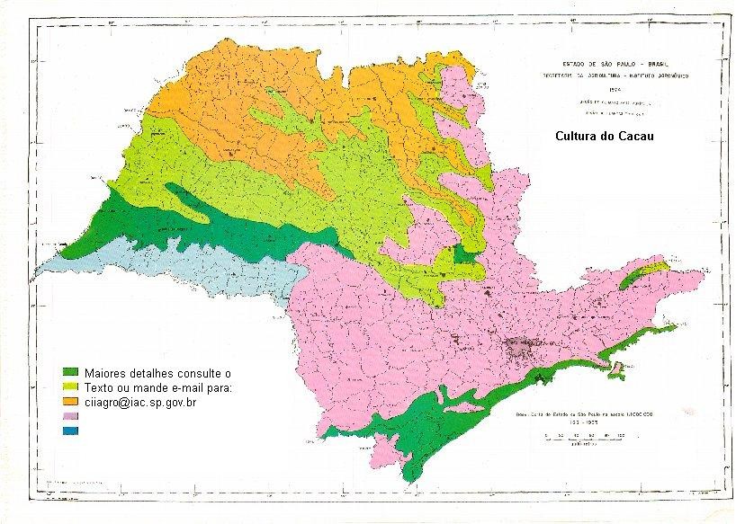 No preparo da carta de aptidão climática da cacauicultura foram consideradas as exigências dos cultivares de interesse comercial para o Estado de São Paulo. Para a definição dos parâmetros climáticos consideram-se os dados existentes na literatura e também valiosas indicações oferecidas diretamente por pesquisador em cacauicultura.